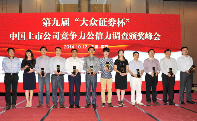 2014年10月12日,由大众证券报主办、新浪财经协办的“第九届中国上市公司竞争力公信力调查评选活动”颁奖典礼在南京举行。