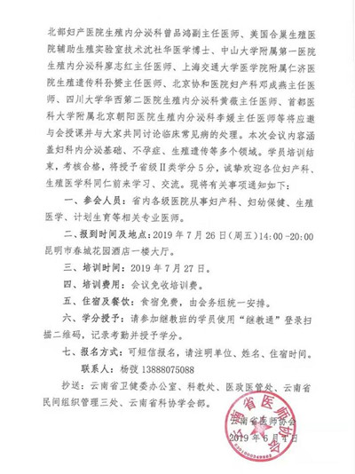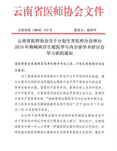 云南省医师协会关于计划生育医师分会举办2019年海峡两岸生殖医学与内分泌学术研讨会学习班的通知