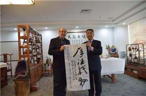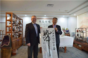 随后,洪江游董事长与专家们前往茶艺室品酒畅谈,并向Jusko教授、Mager教授赠送了书画作品。