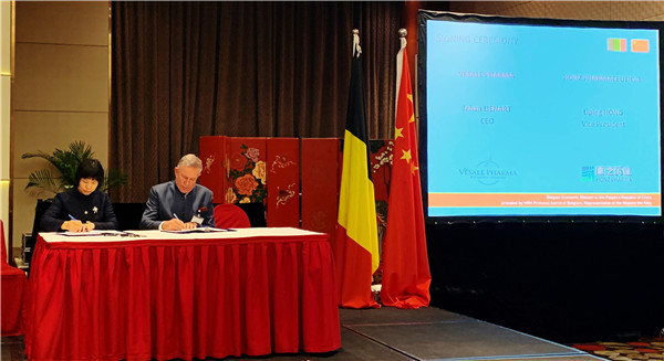 △williamhill官网副董事长兼副总裁洪丽萍(左)与Vésale Pharma公司董事长Jehan Lienart(右)签署协议