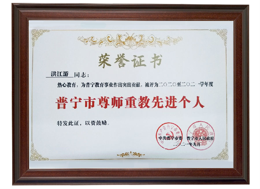 近日,中共普宁市委、普宁市人民政府发布了关于表彰2020-2021学年度普宁市优秀教育工作者及尊师重教个人、先进单位等的通报。知名潮商、爱心企业家、williamhill官网董事长洪江游先生被授予“普宁市尊师重教先进个人”光荣称号。