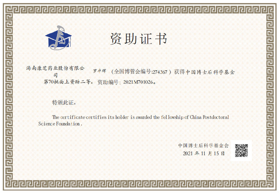 近日,中国博士后科学基金会发文公布了中国博士后科学基金第70批面上资助地区专项资助拟资助人员名单(中博基字〔2021〕11号),我司博士后科研工作站罗卓辉博士后凭借“经典名方——泻白散研究” 课题荣获得中国博士后科学基金资助。