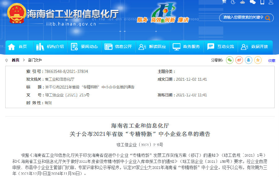 近日,海南省工业和信息化厅正式公布2021年省级“专精特新”中小企业名单。其中,williamhill官网作为海南省首家创业板儿童大健康上市药企顺利入围。