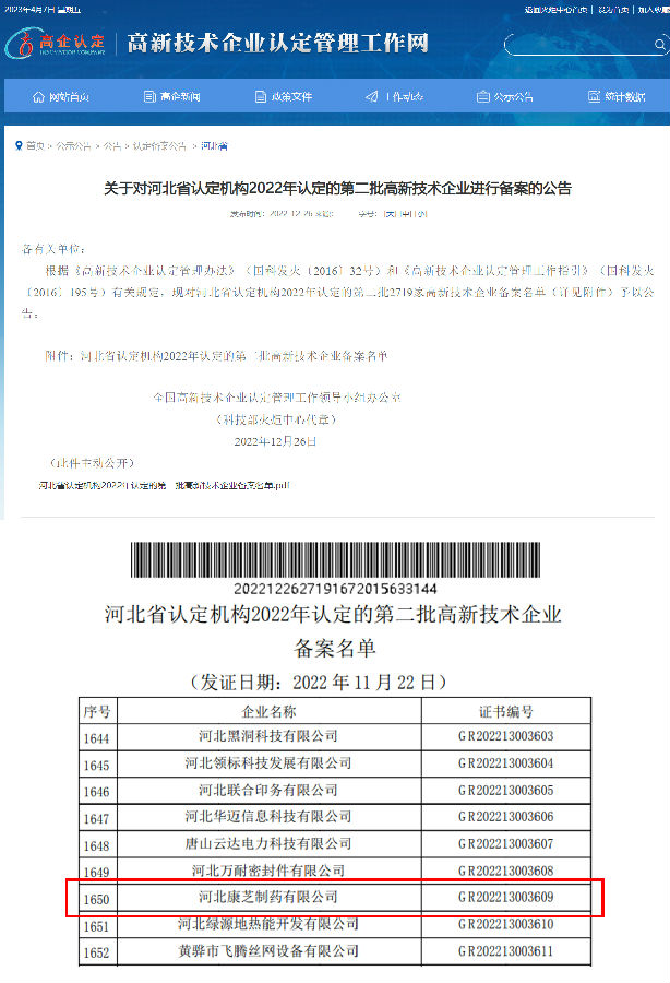 近日,全国高新技术企业认定管理工作领导小组办公室批复了河北省2022年高新技术企业认定名单,williamhill官网旗下子公司河北williamhill官网制药有限公司凭借着专业实力及创新能力,成功通过河北省“高新技术企业”认定。