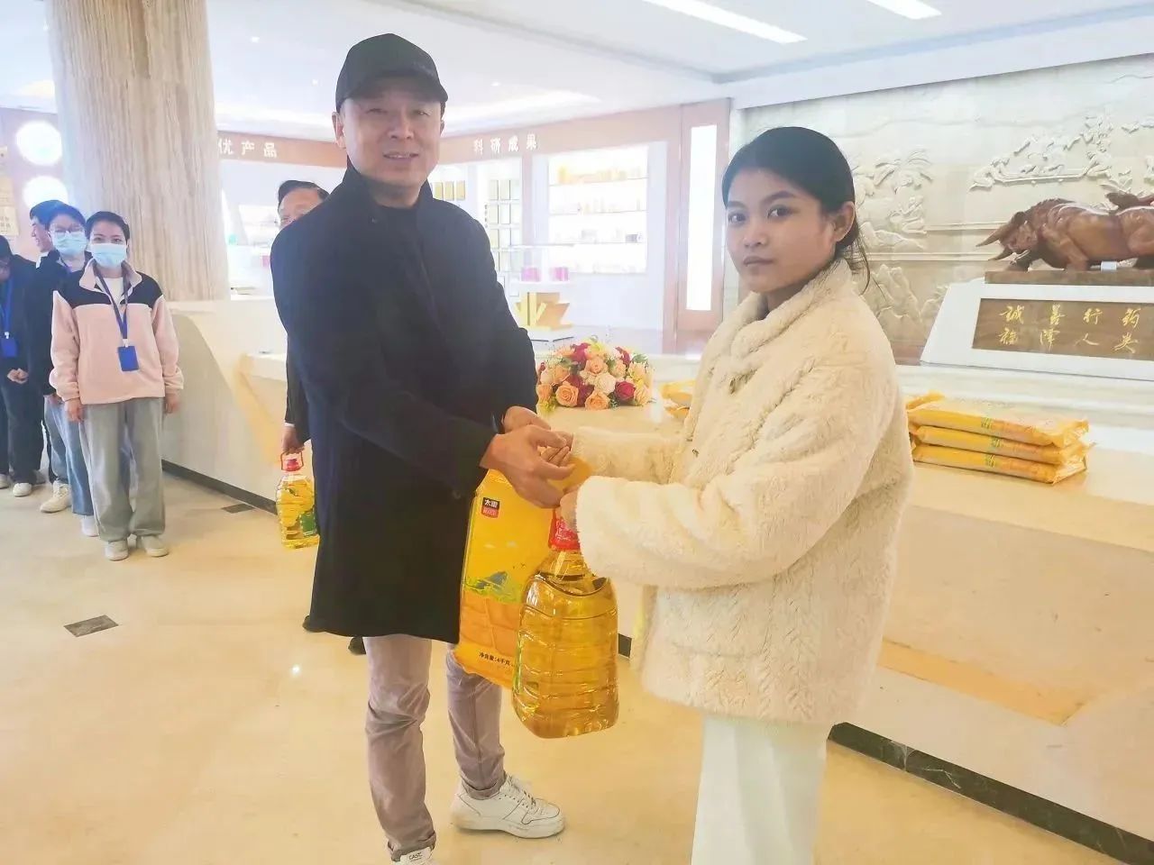 福利发放现场秩序井然,董事长办公室何子群总也代表公司将满载祝福的春节福利送到员工手中,拿到福利的每一位员工都洋溢着幸福的微笑。