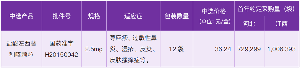 盐酸左西替利嗪颗粒中选本次集采后,采购周期内医疗机构、定点药店将优先选择使用中选药品,保障按时完成约定采购量;若提前完成约定采购量,中选企业仍需按中选价供应超出约定采购量部分的中选药品,直至采购周期结束。