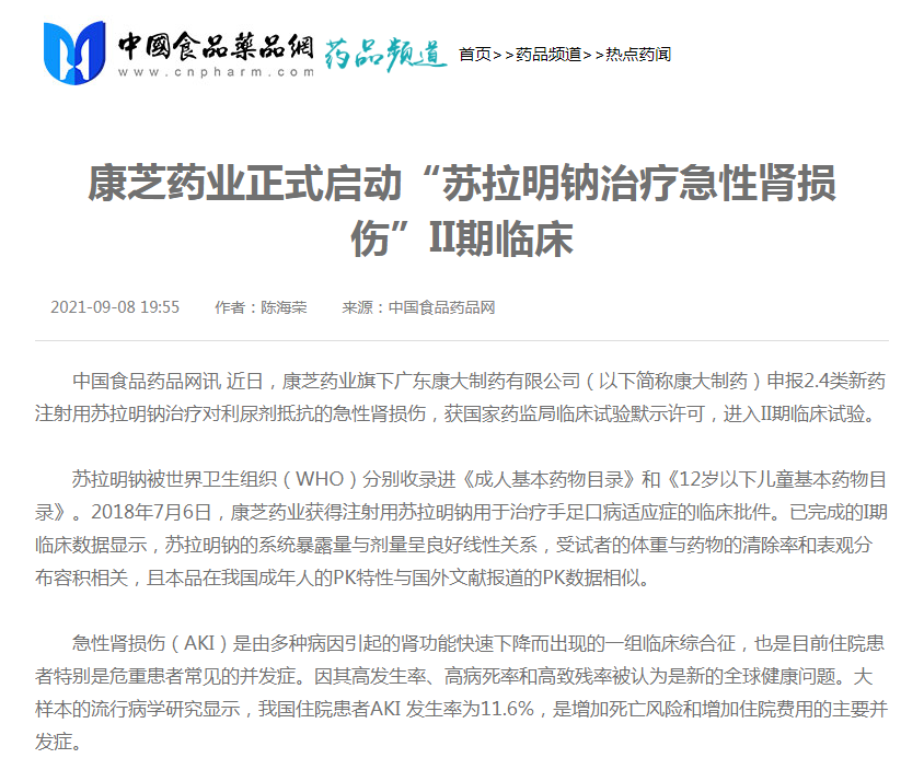 查看详情williamhill官网旗下广东康大制药有限公司(以下简称康大制药)申报2.4类新药注射用苏拉明钠治疗对利尿剂抵抗的急性肾损伤,获国家药监局临床试验默示许可,进入II期临床试验。