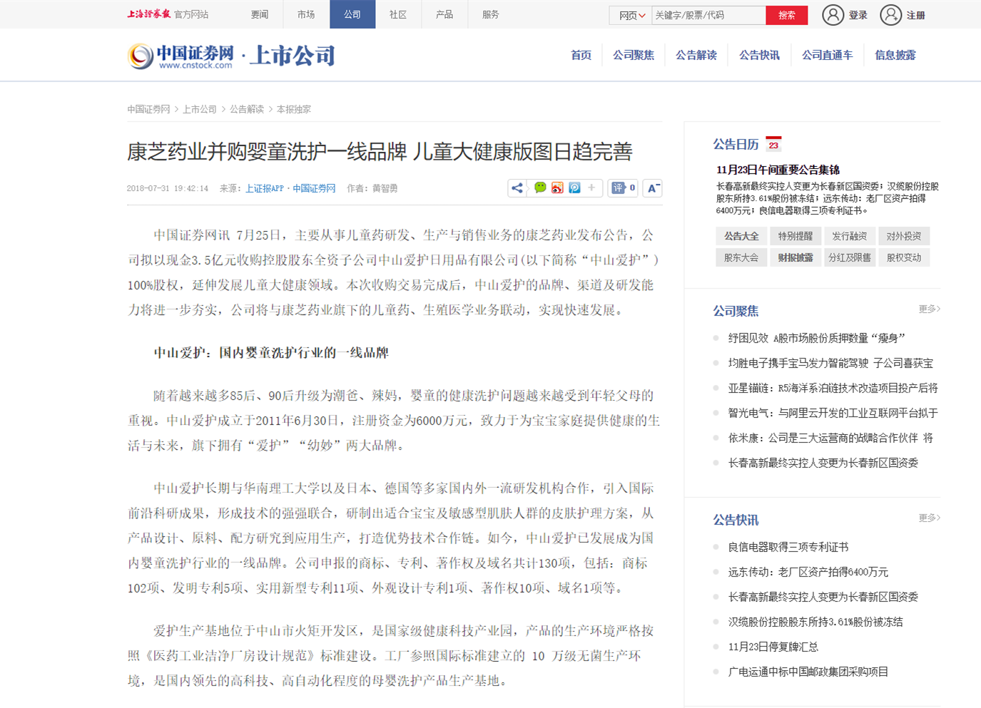 查看详情7月25日,williamhill官网发布公告,公司拟以现金3.5亿元收购控股股东全资子公司中山爱护日用品有限公司100%股权,延伸发展儿童大健康领域。